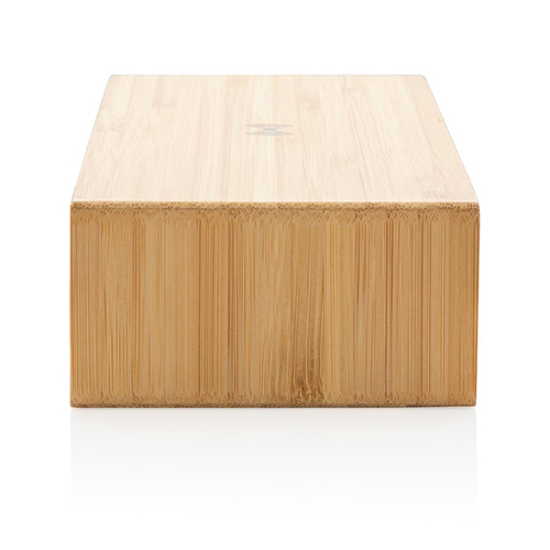 Бездротова док-станція з вбудованим цифровим годинником та функцією будильника виконана з натурального бамбука. 24-годинний формат часу. На задній панелі є порт USB для заряджання за допомогою кабелю. У комплект входить 150-сантиметровий кабель micro USB із матеріалу TPE (без ПВХ). Функція бездротової зарядки підходить для пристроїв, що підтримують QI (смартфони Android останнього покоління, iPhone 8 і вище). Вхід: 5 В/1,5 А; бездротовий вихід: 5 В/1 А – 5 Вт; 1 порт USB: 5 В/1 А.