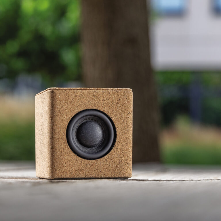 Бездротова колонка зроблена з натуральної пробки. Акумулятор 500 мАг дозволяє слухати музику до 4 годин без перерви. На повну зарядку пристрою потрібно всього 2 години. BT 5.0 забезпечує стійке з’єднання на відстані до 10 метрів. І колонка, і аксесуари зроблені без ПВХ.