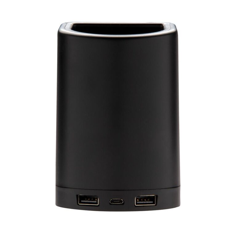 Зарядіть свій телефон з цим зручним аксесуаром 2 в 1 з функцією бездротової зарядки і підставки для ручок. Просто помістіть свій мобільний пристрій на поверхню док-станції, і воно автоматично почне заряджатися. Завдяки незвичайному дизайну корпусу вигравіруваний на ньому логотип буде підсвічуватися, роблячи ваш бренд максимально помітним. Підставка для ручок прекрасно підійде для зберігання дрібних предметів і допоможе підтримувати чистоту і порядок на робочому столі. Док-станція може використовуватися для роботи з будь-якими мобільними девайсами, що підтримують стандарт Qi *, такими як пристрої Android останнього покоління і iPhone 8 або вище. У комплекті йде USB кабель довжиною 1,5 метра. Напруга на вході: 5V / 3A. Напруга на виході: 5V / 1A 5W. * Qi – стандарт, розроблений Консорціумом бездротової електромагнітної енергії для індукційної передачі енергії на відстань до 4 см.