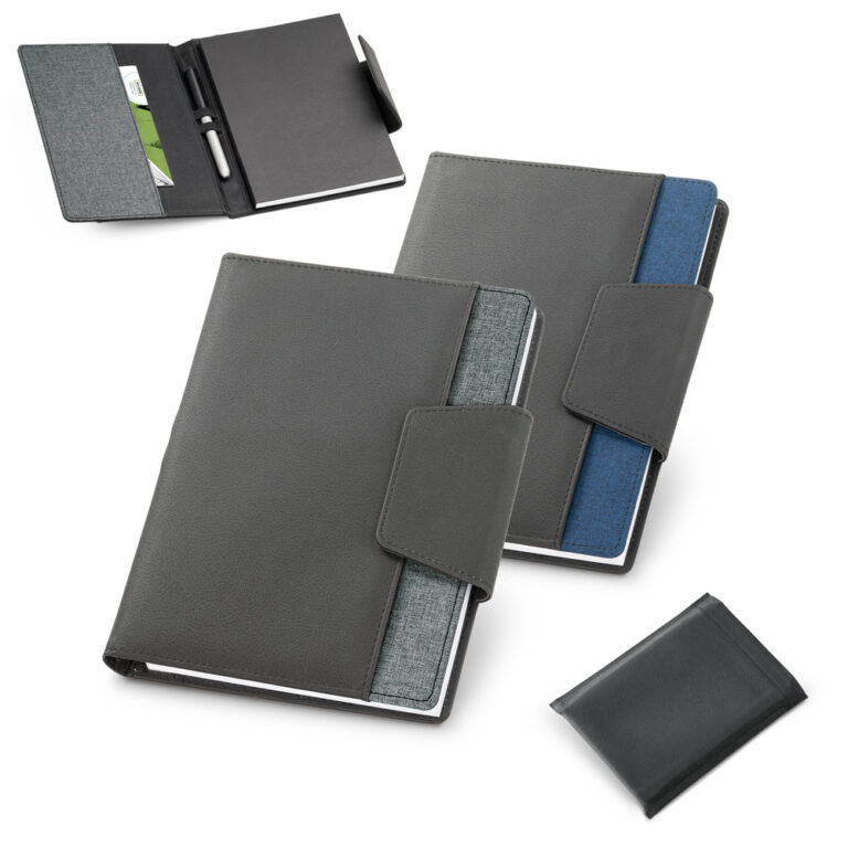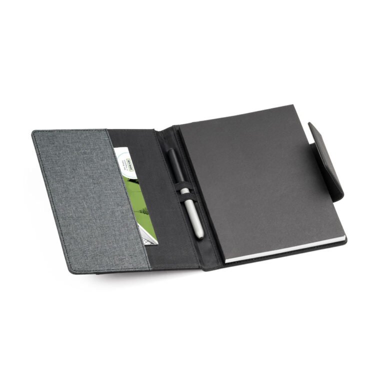 Папка з блокнотом. Штучна шкіра і поліефірна тканина. Магнітна застібка і зовнішня кишеня. Знімна панель: 160 сторінок без лініюванням. З внутрішньою кишенею і тримачем кулькової ручки. Поставляється в нетканому мішку. Кулькова ручка не входить в комплект.155 x 215 мм | Мішок: 205 x 250 мм
