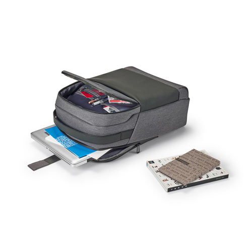 Рюкзак для ноутбука. 600D катіонний оксфорд і штучна шкіра. Водонепроникний, стійкий до розривів, усадки або інших деформацій. З 2 відділеннями. Заднє відділення з м’якою перегородкою для комп’ютера до 15.6 ”. Передня кишеня з різними внутрішніми кишенями. Внутрішня обшивка і набивка. Задня частина та ручки м’які, з набиванням. Задній ремінь для кріплення до валізи і знімною металевою пластиною з магнітом для персоналізації. 300 x 430 x 150 мм | Пластина: 50 x 20 мм