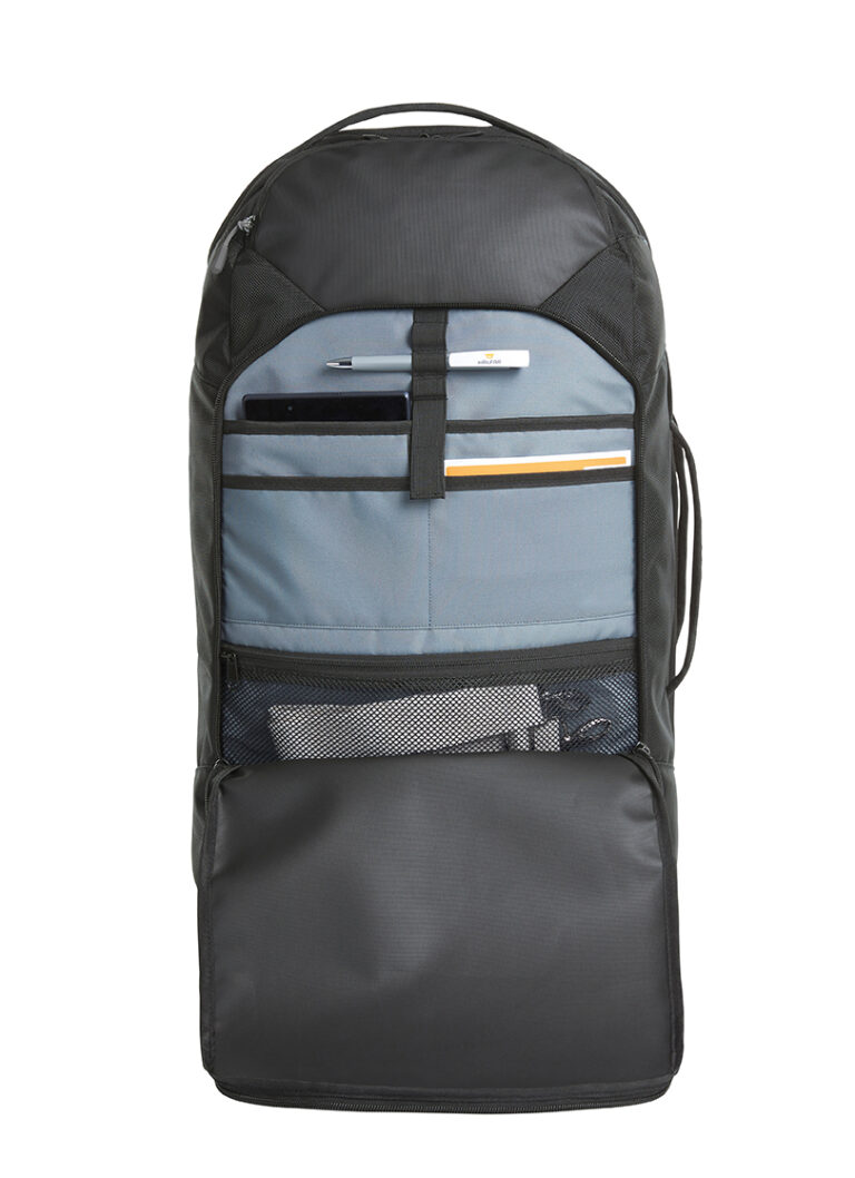 Основне відділення з двосторонньої блискавкою з трьох сторін; верхня частина основного відділення з роздільником на блискавці; дно основного відсіку з еластичними пакувальними ременями; невеликі передні кишені на блискавці з кольоровими повзунками на блискавки; велика передня кишеня з двосторонньої блискавкою, плоский, м’який чохол, два маленьких мішечка, великий карман на блискавці і еластичні петлі; м’які ручки; посилена база; телескопічна ручка; легко котяться колеса висота (см): 65 ширина (см): 35 глибина (см): 28