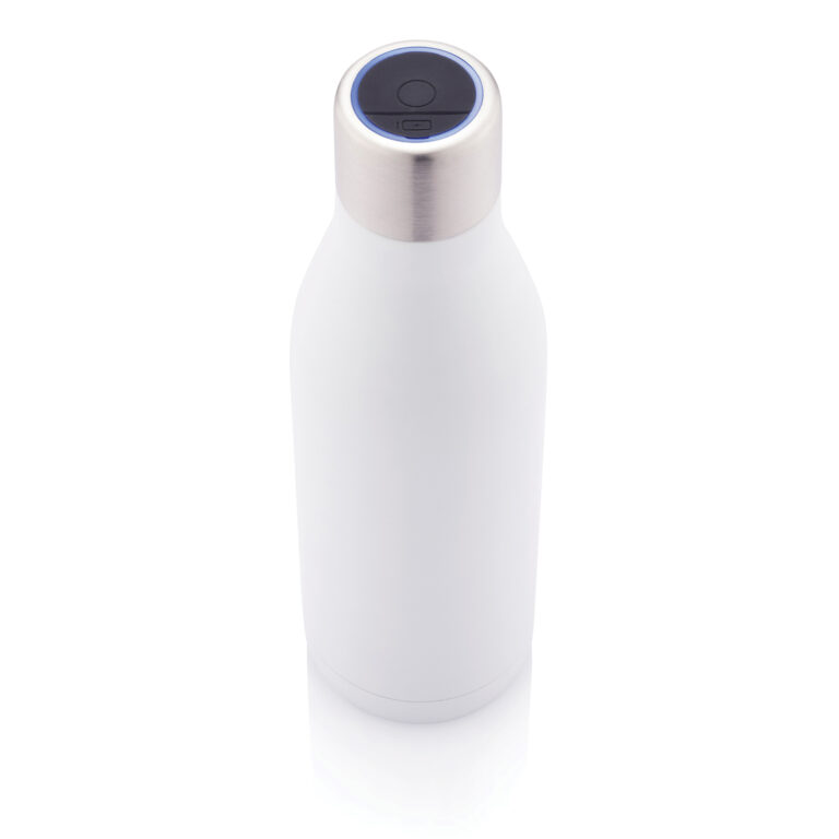 Унікальна вакуумна пляшка з нержавіючої сталі оснащена світлодіодною технологією UV-C стерилізації. Це дозволяє очистити внутрішню поверхню пляшки, усунути сторонні запахи, бактерії і віруси всього за 5 хвилин. Бездоганний дизайн. Пляшка здатна зберегти ваші напої холодними до 15 годин і гарячими до 5 годин, завдяки подвійним стінкам із нержавіючої сталі. Оснащена літій-полімерним акумулятором 180 мАг, який легко підзарядити через USB. Ємності акумулятора досить, щоб простерилізувати пляшку до 14 разів на одному заряді. Обсяг 500 мл. Не містить BPA.